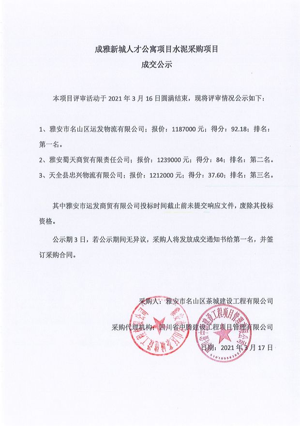 成雅新城人才公寓砂石、塔機租賃、土石方、鋼材、管架租賃、模板木方、水泥采購項目成交公示