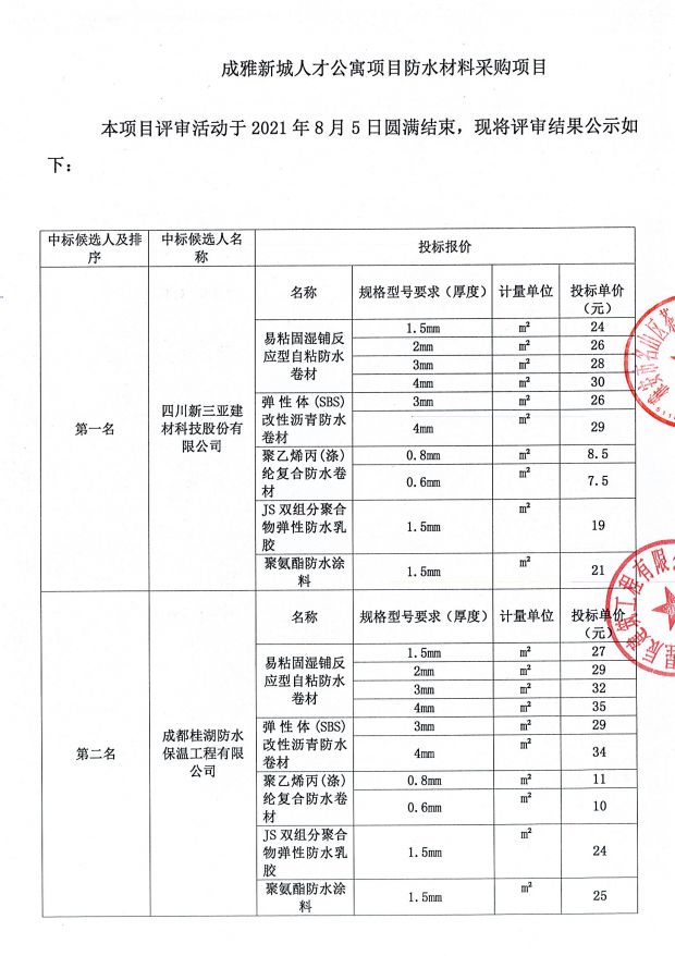 成雅新城人才公寓項目防水材料采購中標公示